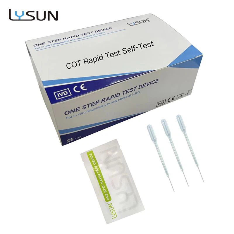 Экспресс-тест на котинин – это быстрый,-удобный в использовании тест-полоска для определения котинина, ключевого биомаркера употребления никотина. Он обеспечивает четкие, наглядные результаты в течение 5 минут, что делает его идеальным для тестирования на рабочем месте, в клинических условиях и программах здравоохранения. Благодаря высокой точности (общее согласие с ГХ/МС 99,35%) и превосходной воспроизводимости он обеспечивает надежную работу.